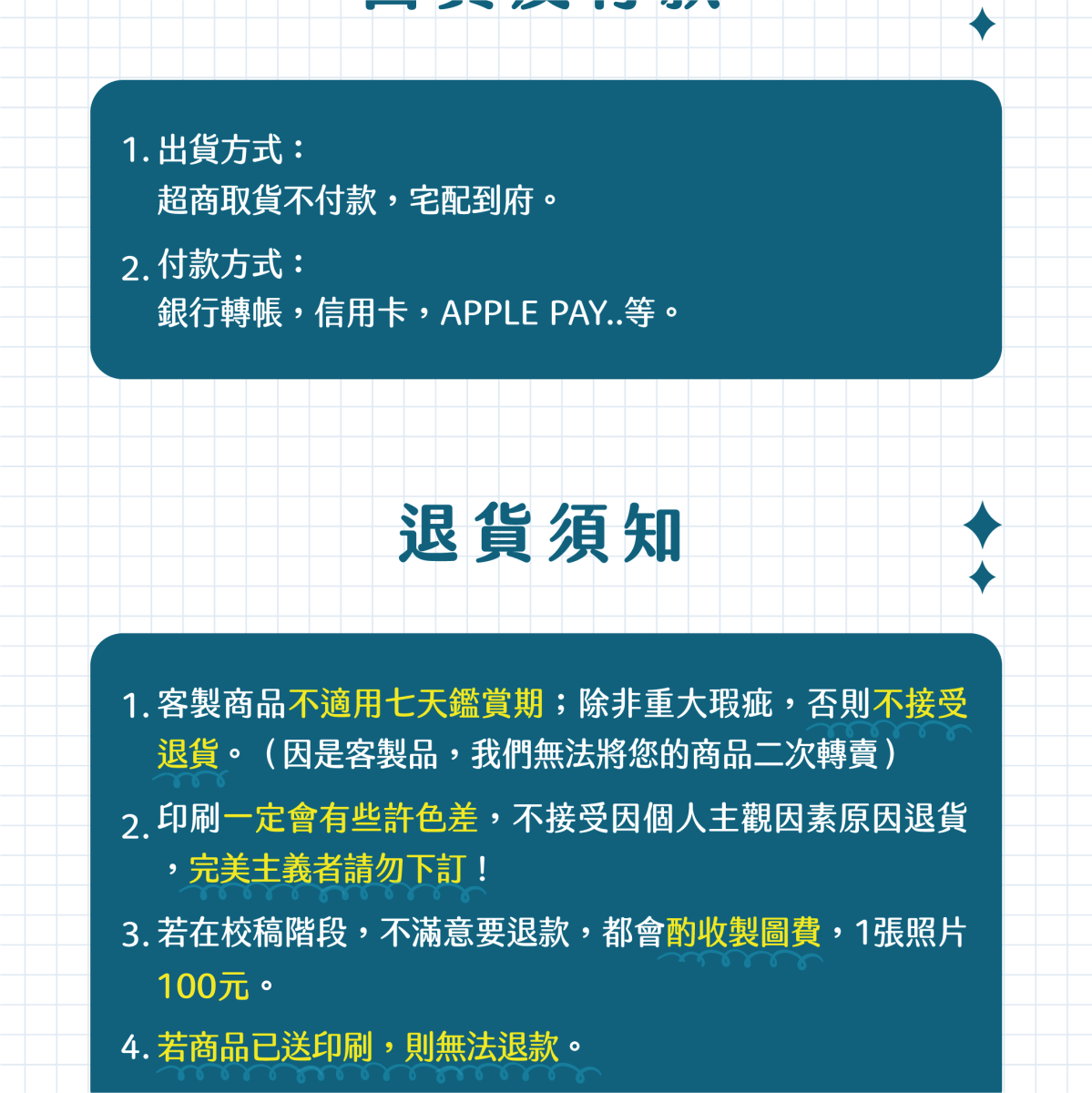 ⚠️ 未於期限內完成提供照片與確認校稿,訂單將取消或延後出貨(實際出貨時間為:校稿完成後+20 個工作天)