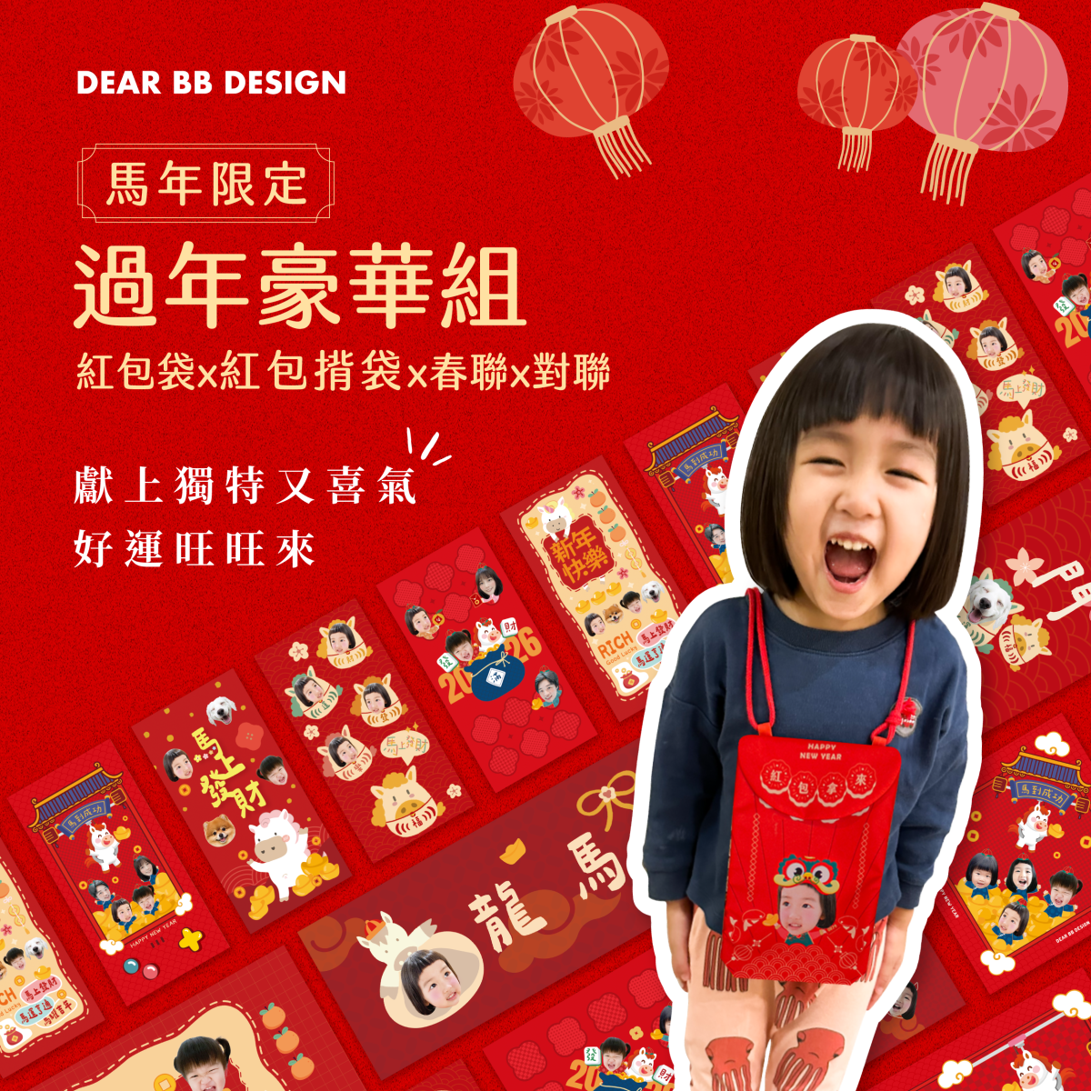 ●過年豪華組:內含客製化紅包袋x1組/春聯x1組/對聯x1組/紅包揹袋x1