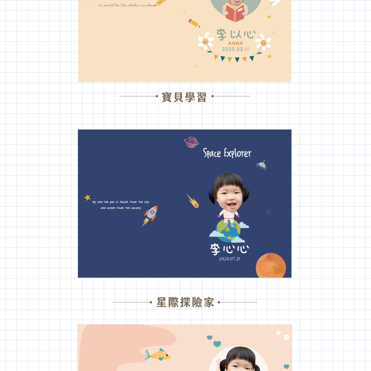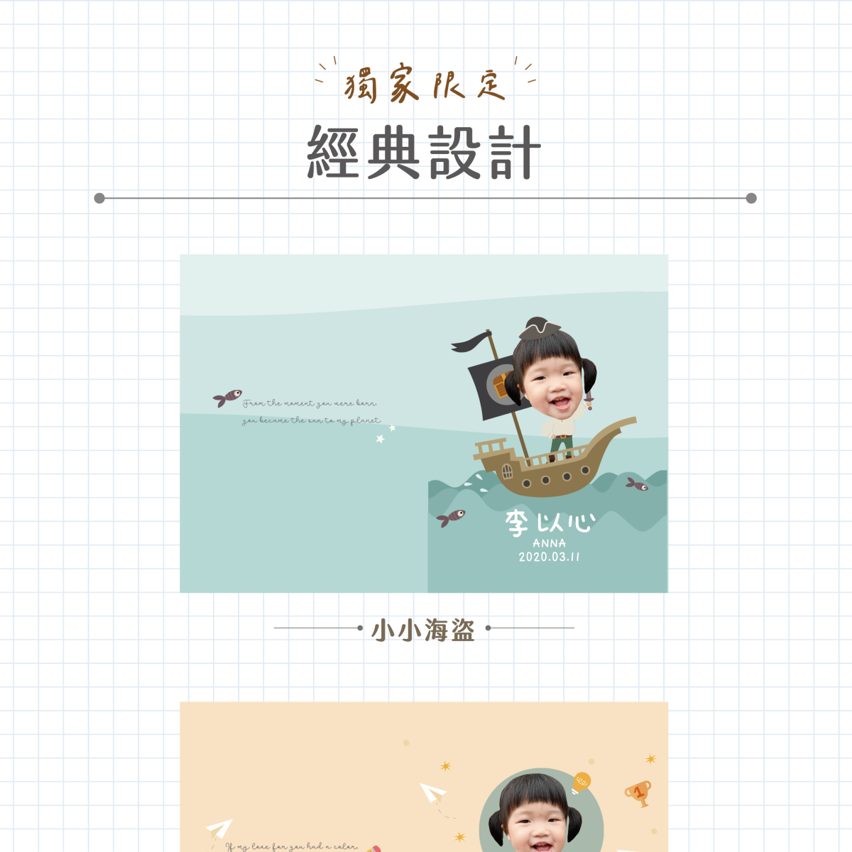 5 款風格主題中挑選,搭配寶寶專屬姓名、生日與可愛頭像客製,