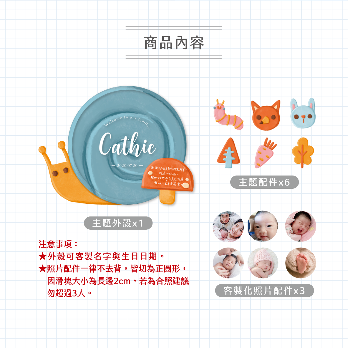 主題外殼x1個+主題配件x6片+客製化照片x6片