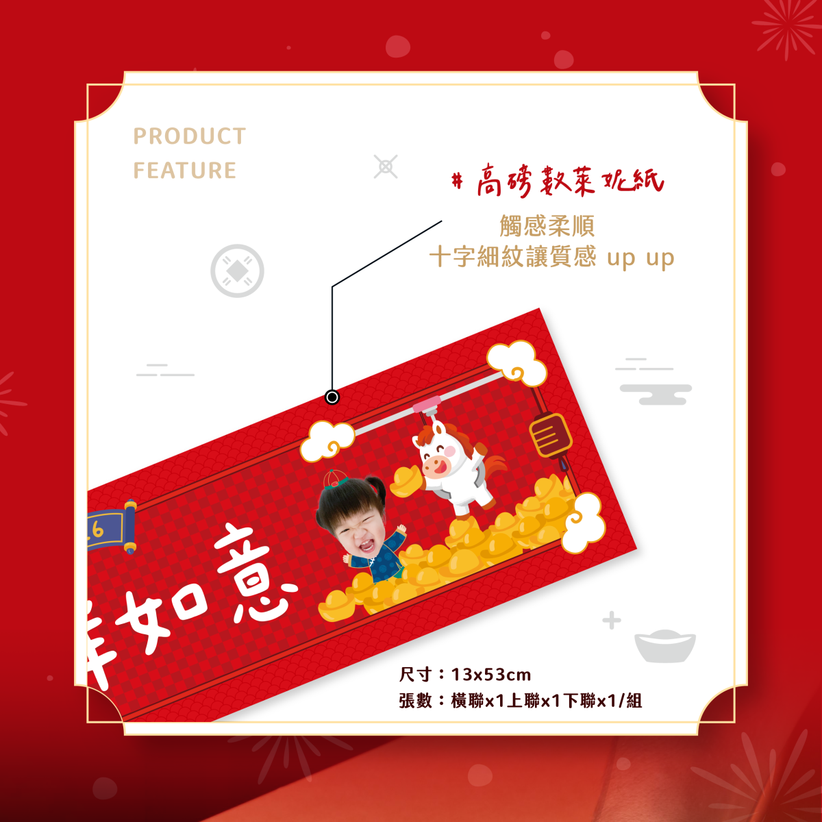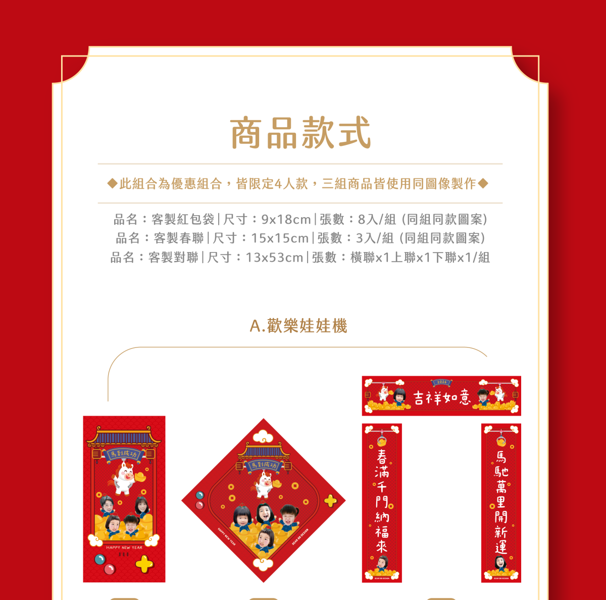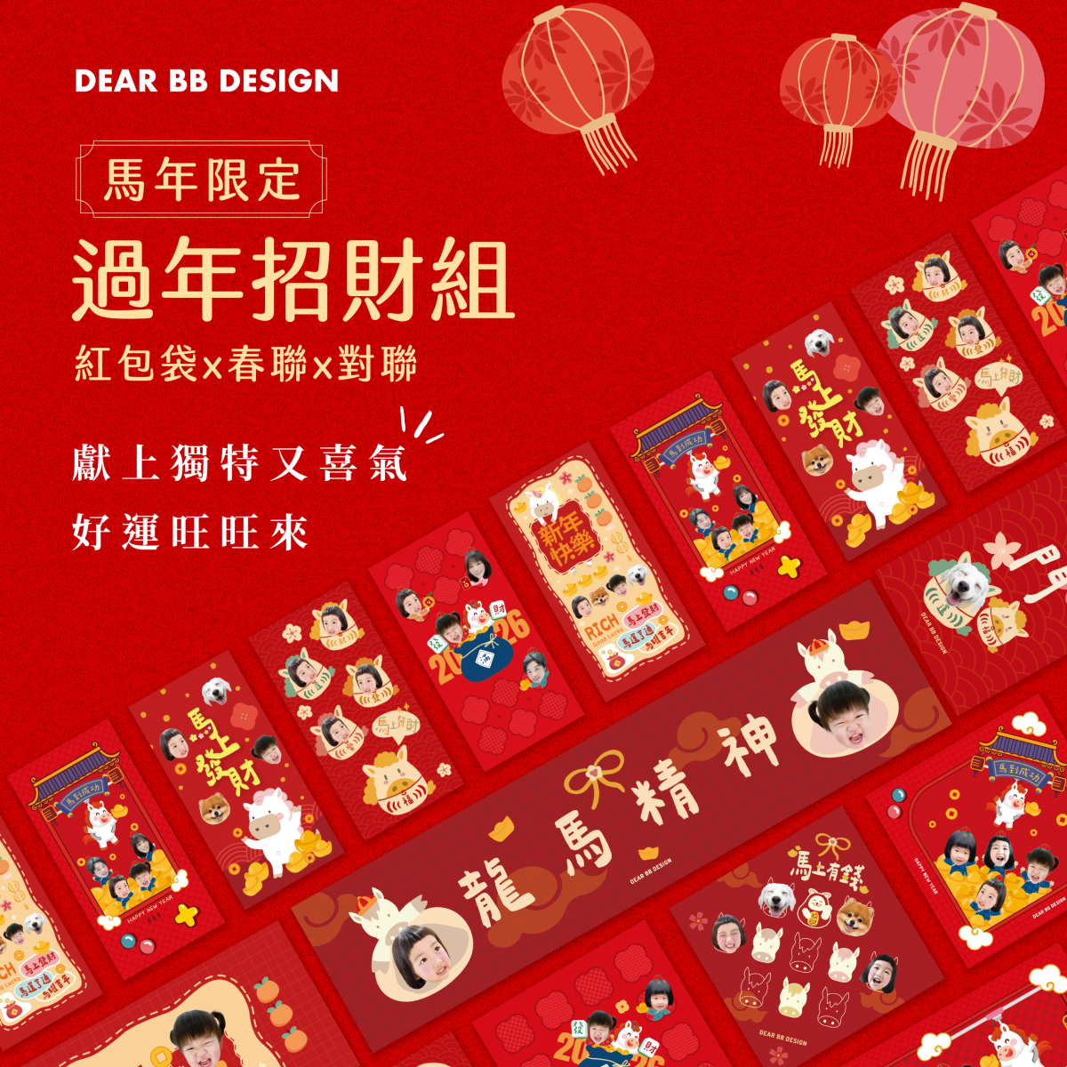●過年招財組:內含客製化紅包袋x1組/春聯x1組/對聯x1組