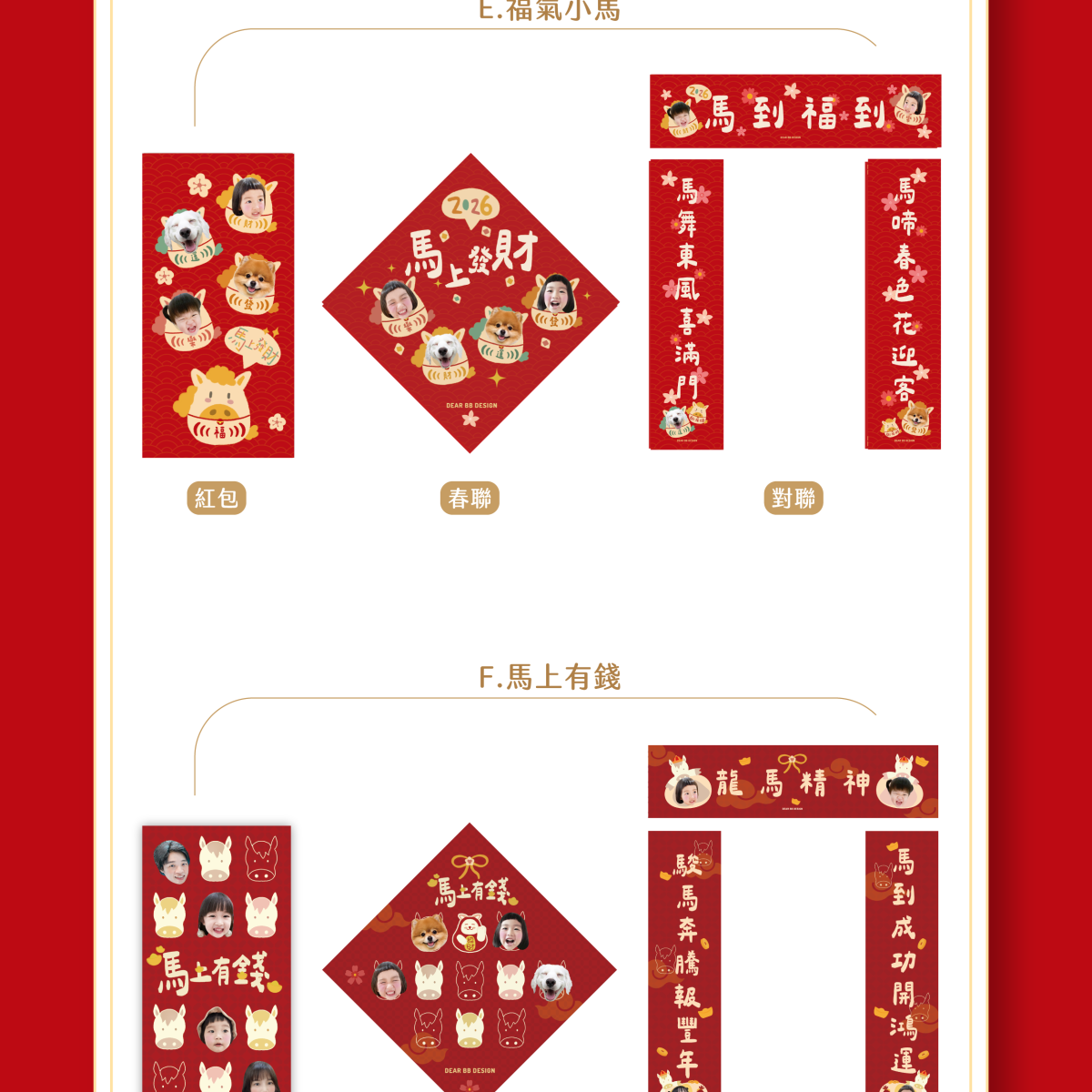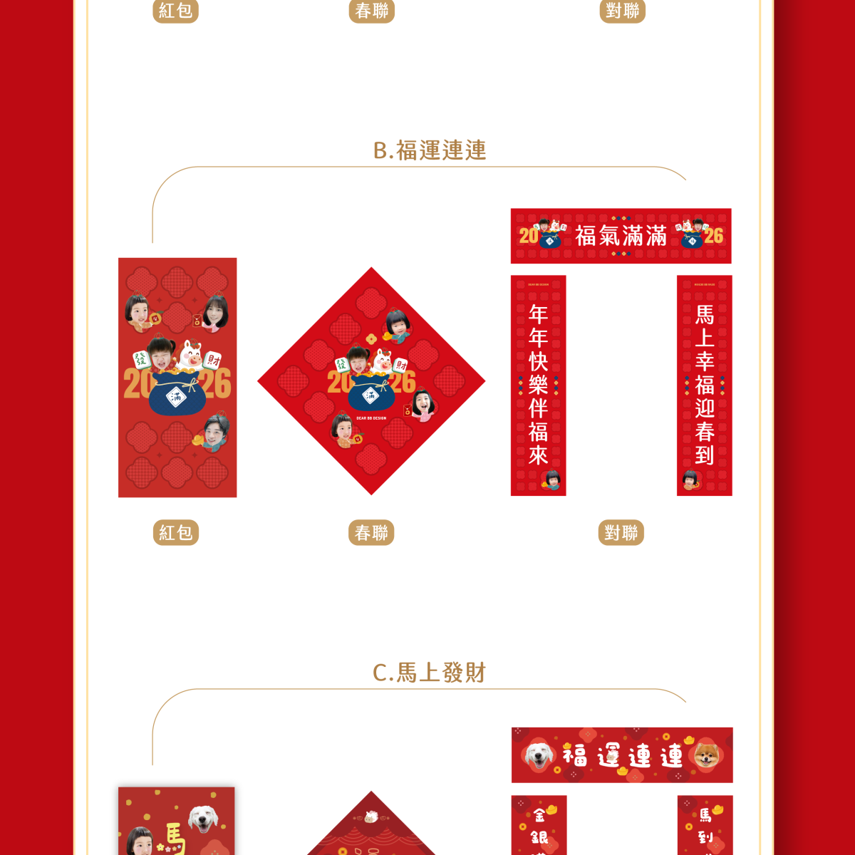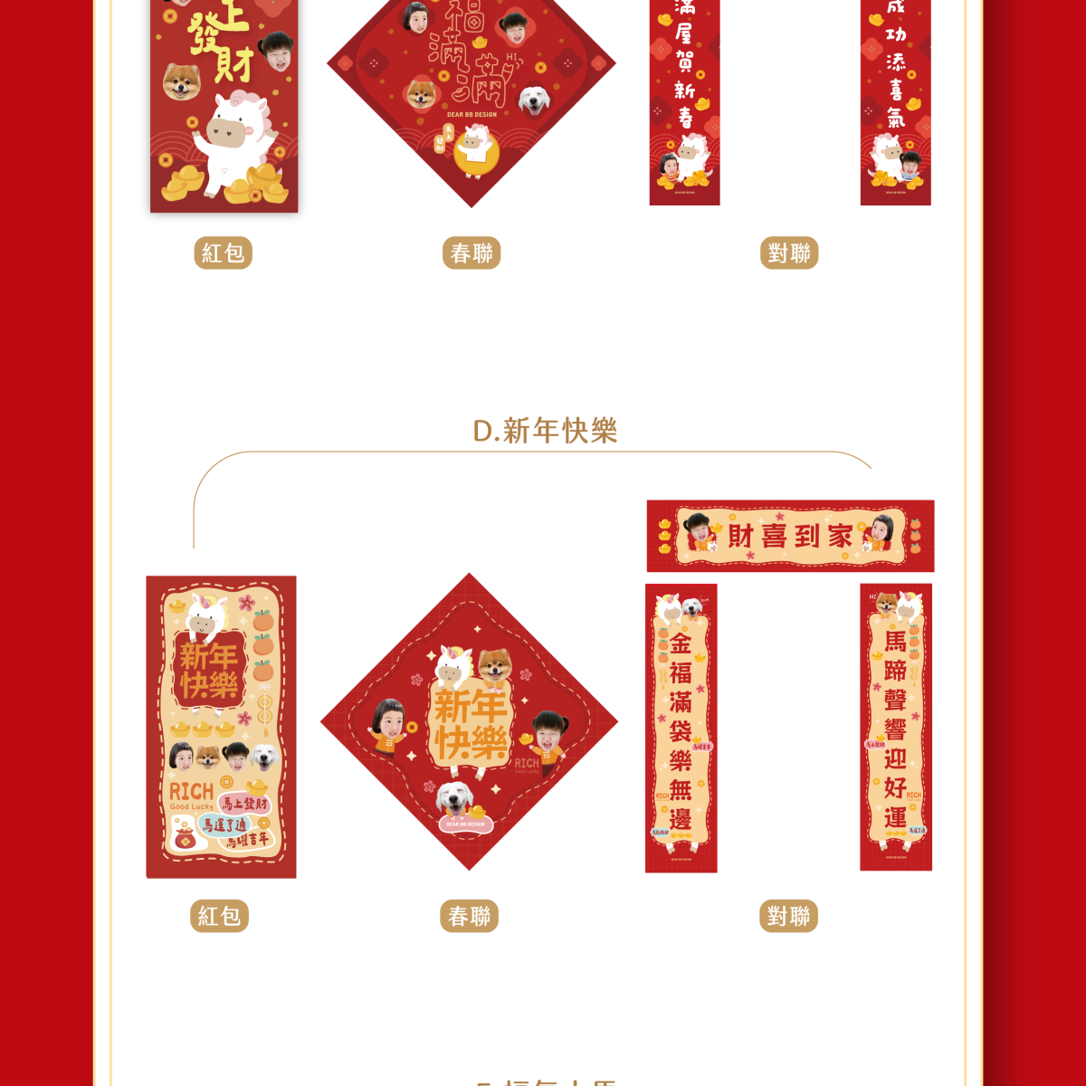 ●過年招財組:內含客製化紅包袋x1組/春聯x1組/對聯x1組