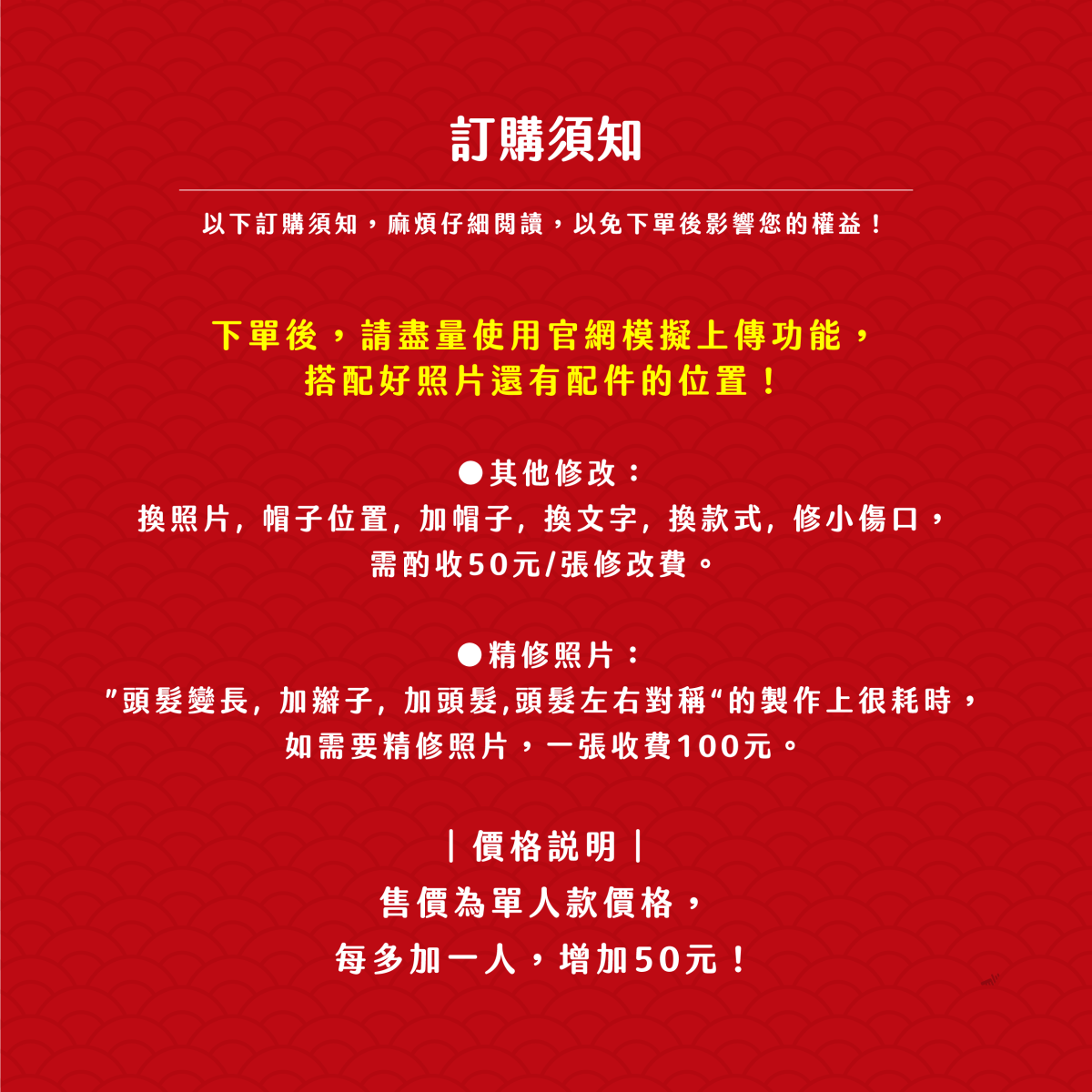 換照片, 帽子位置, 加帽子, 換文字, 換款式, 修小傷口,